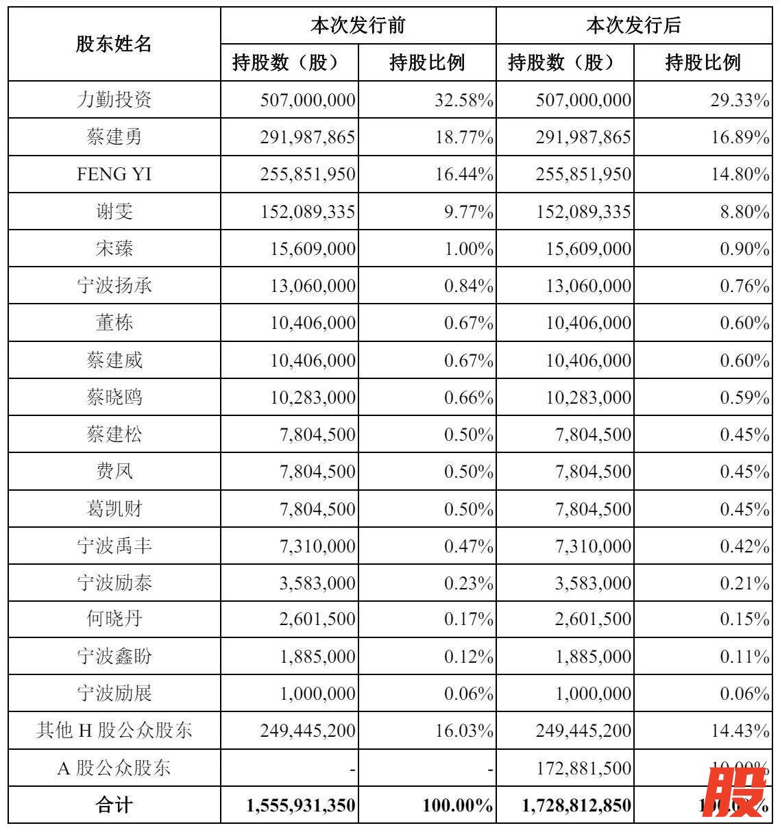 IPO后,力勤投资持股为29.33%,蔡建勇持股为16.89%,FENG YI持股为14.80%,谢雯持股为8.8%,宋臻持股为0.9%,宁波扬承持股为0.76%,董栋、蔡建威分别持股为0.6%,蔡晓鸥持股为0.59%,蔡建松、费凤、葛凯财分别持股为0.45%,宁波禹丰持股为0.42%,宁波励泰持股为0.21%,何晓丹持股为0.15%,宁波鑫盼持股为0.11%,宁波励展持股为0.06%。